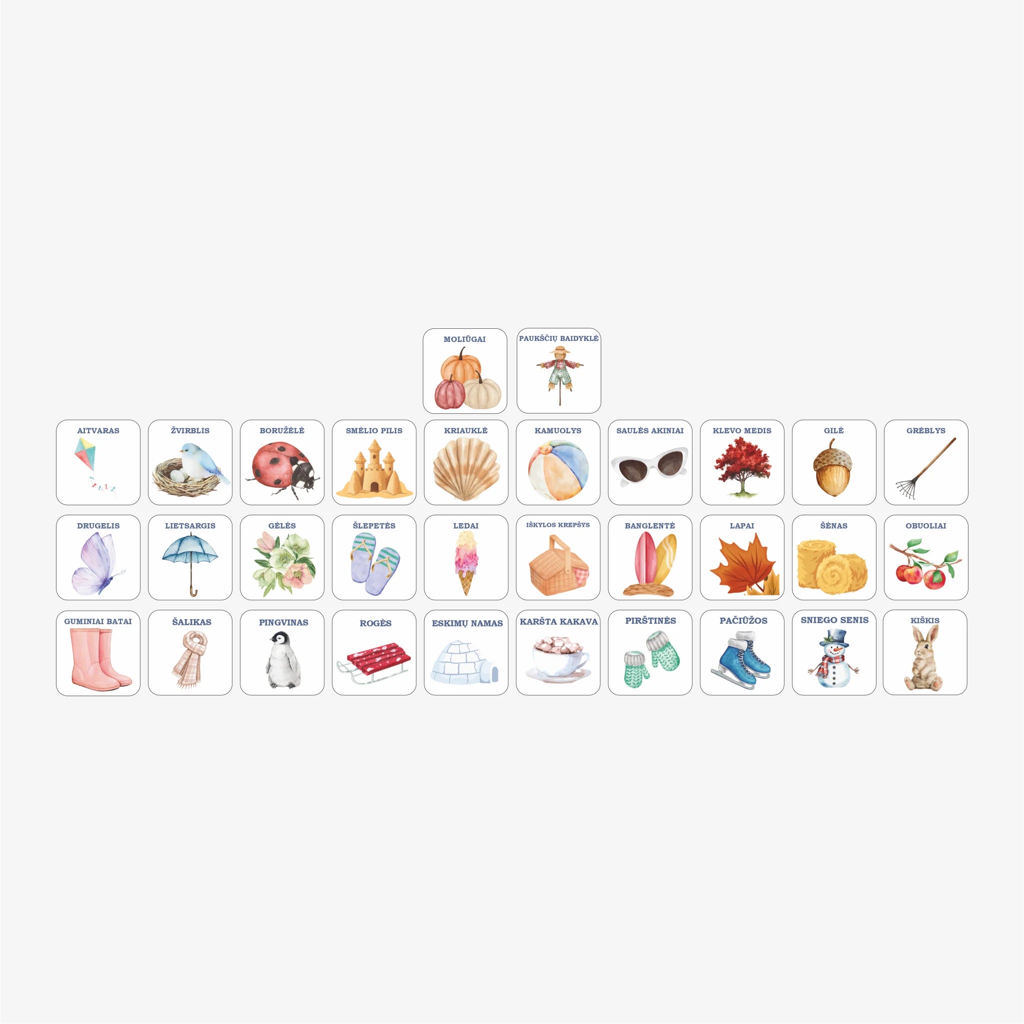 32 magnetines korteles (4 x 4 cm) su daiktais, gyvūnais ir reiškiniais, pvz.: