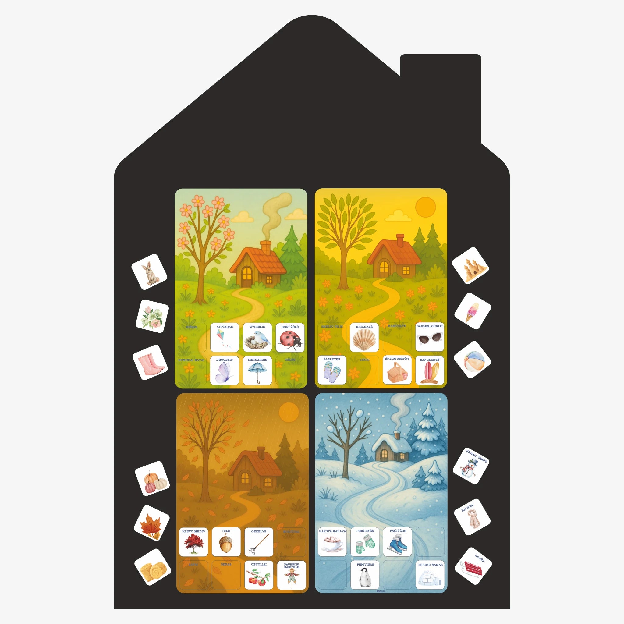 Ši magnetinė metų laikų dėlionė vaikams padeda žaismingai pažinti pavasarį, vasarą, rudenį ir žiemą. Žaidimo tikslas – teisingai priskirti 32 magnetines korteles prie vieno iš 4 metų laikų fonų, remiantis objektų, gamtos reiškinių ar gyvūnų sezoniškumu.