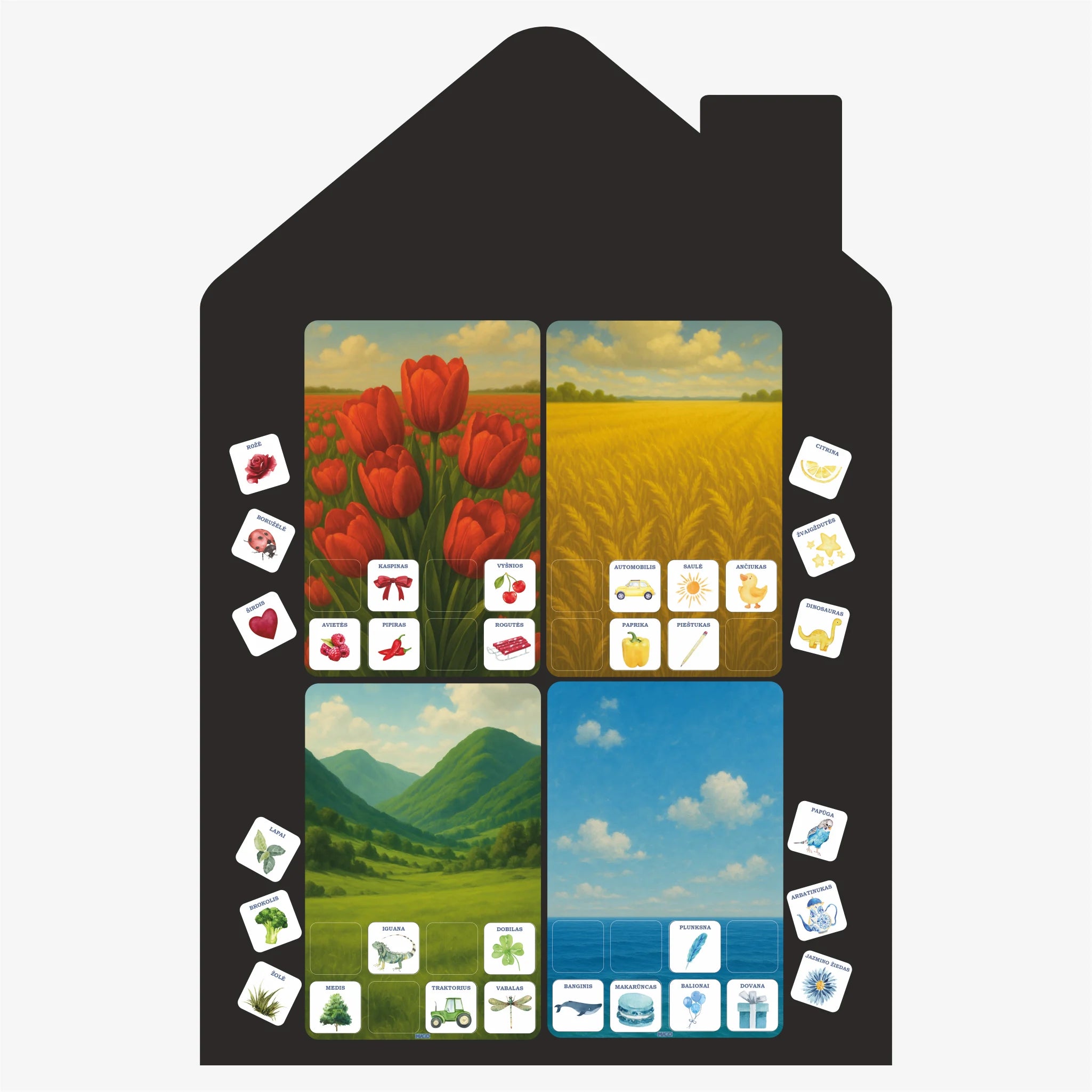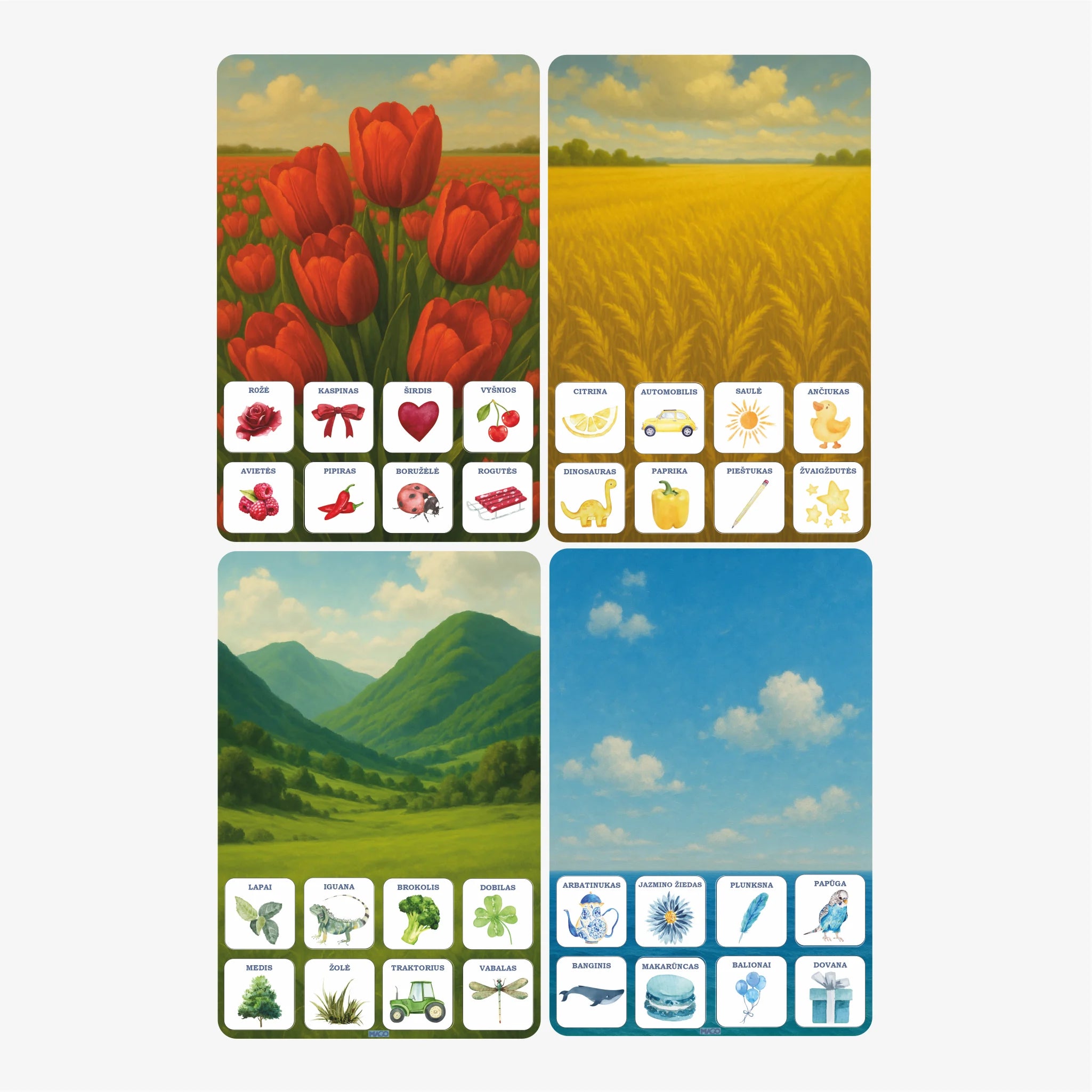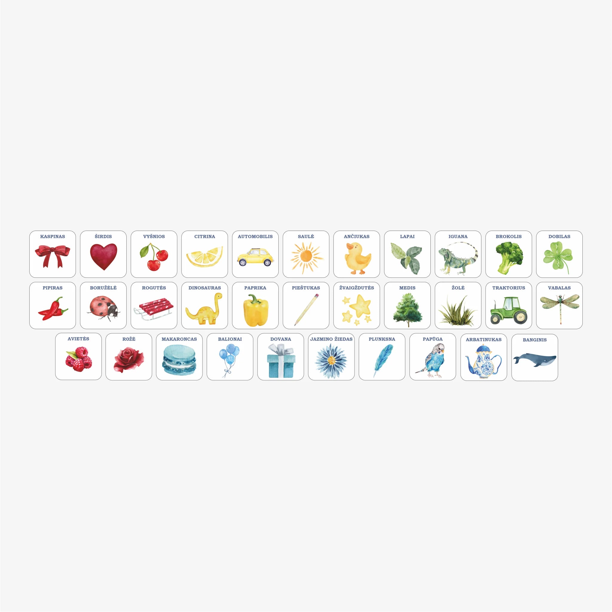 32 kortelės (4 x 4 cm) su daiktais, vaisiais, gamta, gyvūnais ir žaislais.