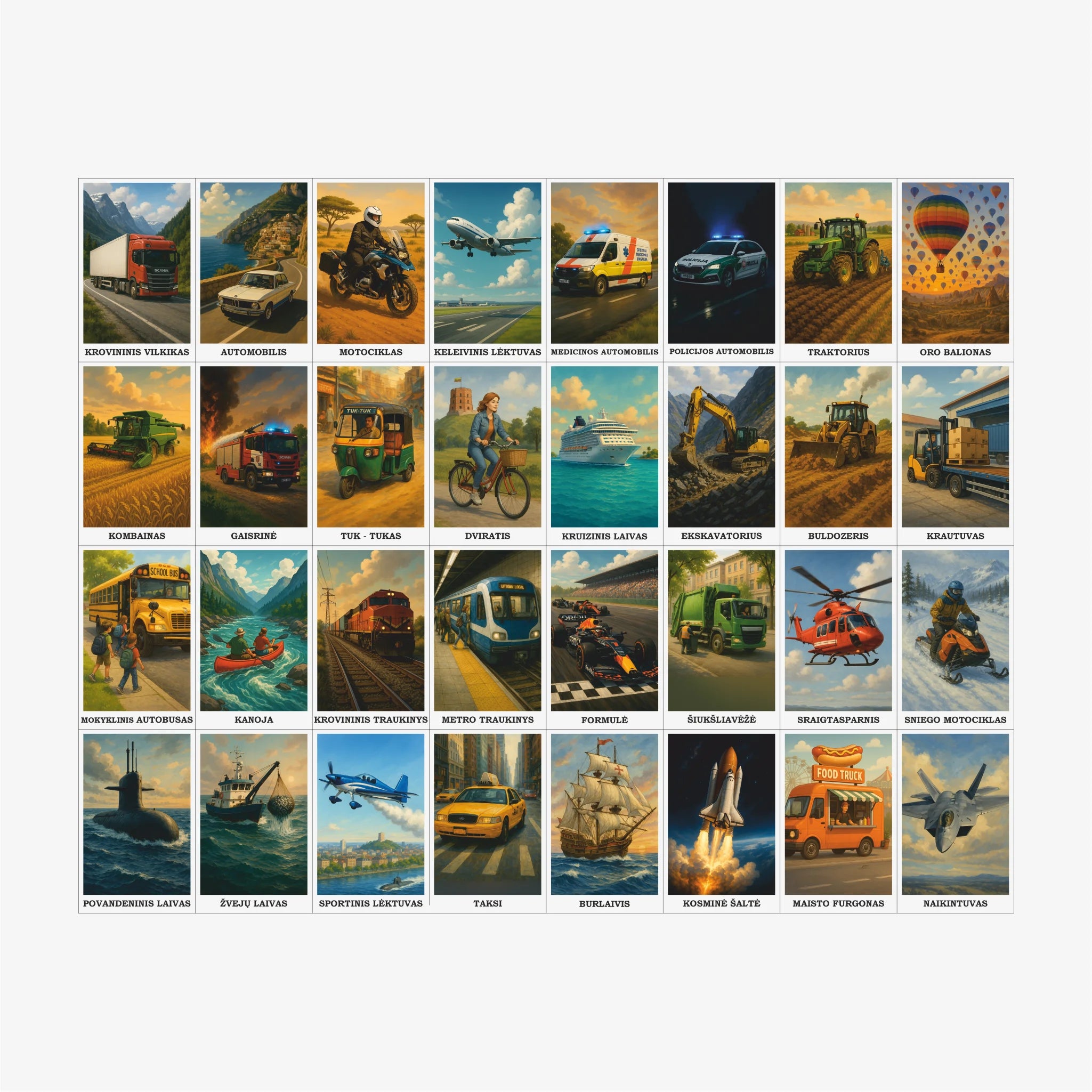 Šis magnetinių transporto priemonių kortelių rinkinys (32 vnt.) kviečia vaikus pažinti įvairias transporto rūšis: žemės, vandens, oro ir specialiosios paskirties transportą. Kiekviena kortelė pateikia realistiškai iliustruotą priemonę ir jos pavadinimą didžiosiomis lietuviškomis raidėmis.