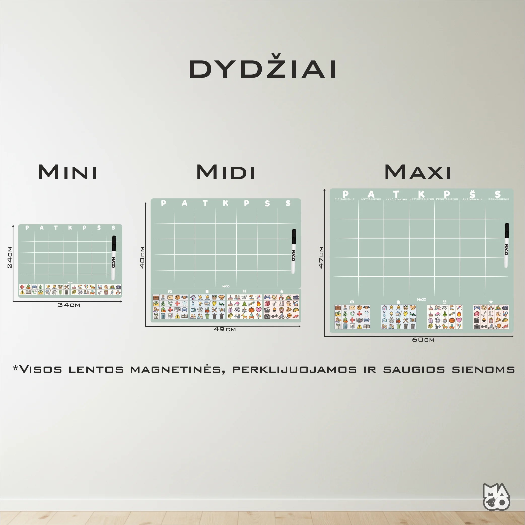 • 🟢 Mini (34×24 cm) – kompaktiškas variantas mažesnėms erdvėms, puikiai tinka prie šaldytuvo ar darbo vietoje.