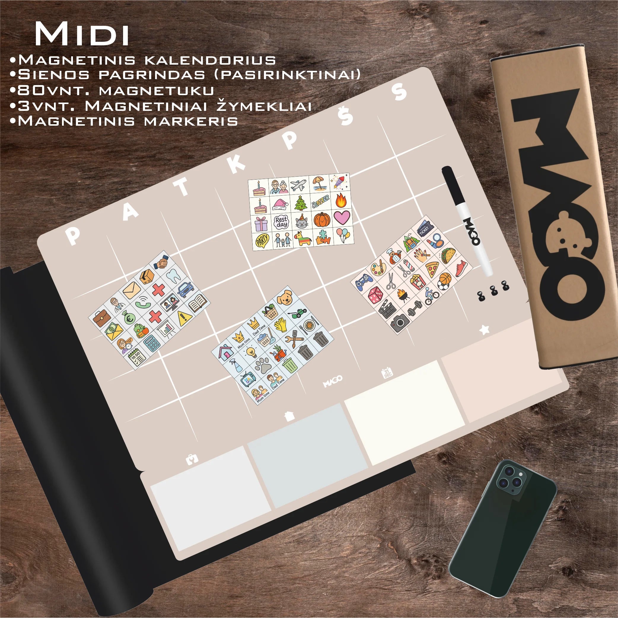 • Midi (49×40 cm) – populiariausias dydis, tinkantis virtuvei ar šeimos planavimo kampeliui.